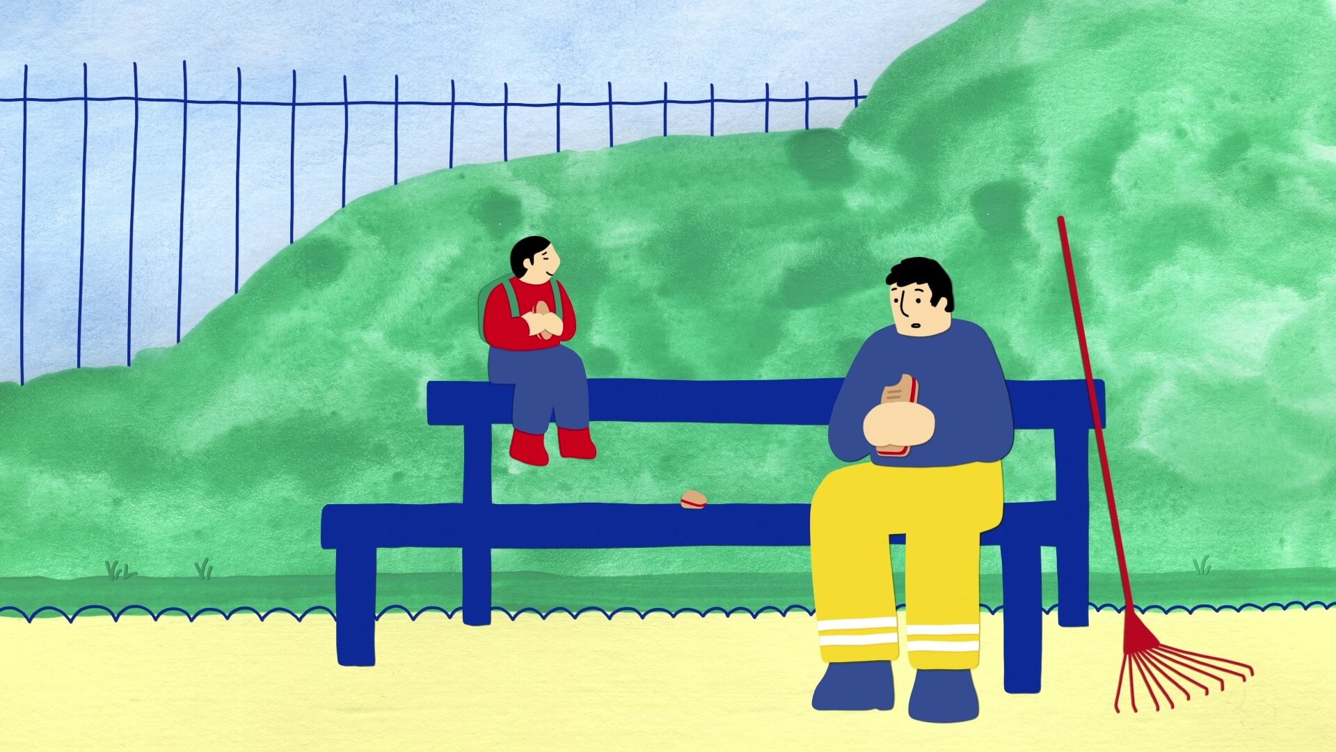In the park, everybody is walking their dogs, except the gardener, who doesn't have one.